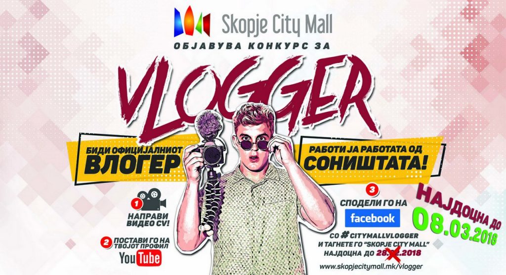 Скопје Сити Мол го бара својот влогер, кој ќе биде прв од ваков тип во Македонија. Истиот ќе се одбере преку конкурс кој ќе трае од 15. февруари до 26ми март кога според различни критериуми ќе се натпреваруваат сите заинтересирани за оваа позиција. Влогер е всушност блогер, но се искажува преку видео формат. Тоа тинејџерите многу добро го знаат бидејќи повеќето ги следат познатите влогери во светот. Ги охрабруваме сите тинејџери од Македонија кои се заинтересирани да бидат официјалниот влогер на Сити Мол да прикачат свое видео CV на социјалните медиуми и да конкурираат на овој оглас за несекојдневна работа.