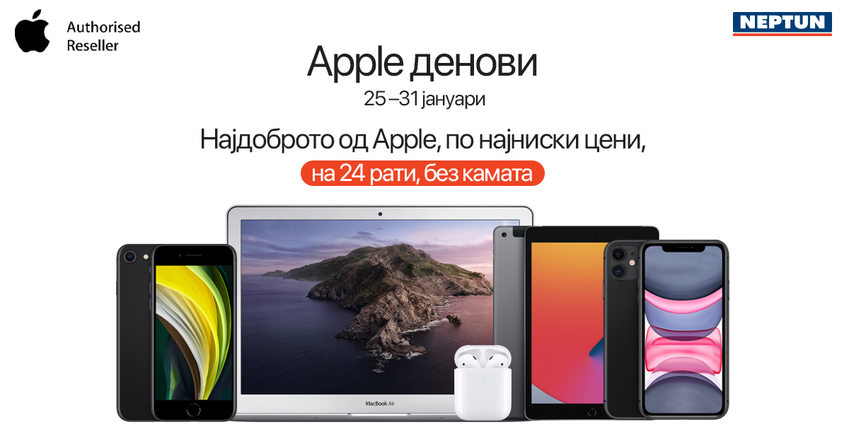 На задоволство на голем број вљубеници во врвниот квалитет, модерниот дизајн и ненадминливите перформанси на Apple производите, Нептун Македонија подготви извонредна Apple понуда – Apple ДЕНОВИ! Не само што ќе можете да ги најдете вашите омилени Аpple производи со неодоливи попусти, туку ќе можете да ги платите на 24 рати БЕЗ камата!