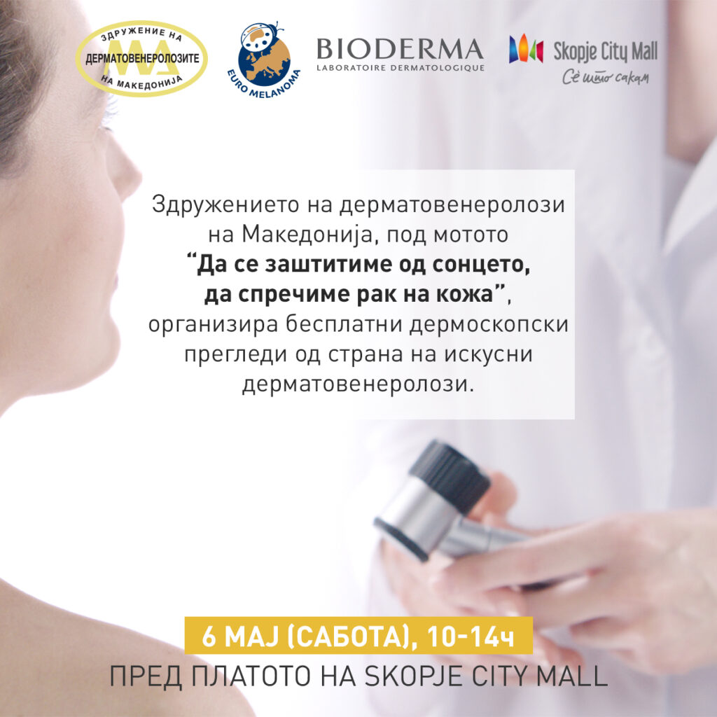 Здружението на дерматовенеролози на Македонија, под мотото “Да се заштитиме од сонцето, да спречиме рак на кожа”, организира бесплатни дермоскопски прегледи од страна на искусни дерматовенеролози. Овој настан е почеток на кампањата Еуромеланома, која ќе се одвива оваа година на територијата на целата држава.
