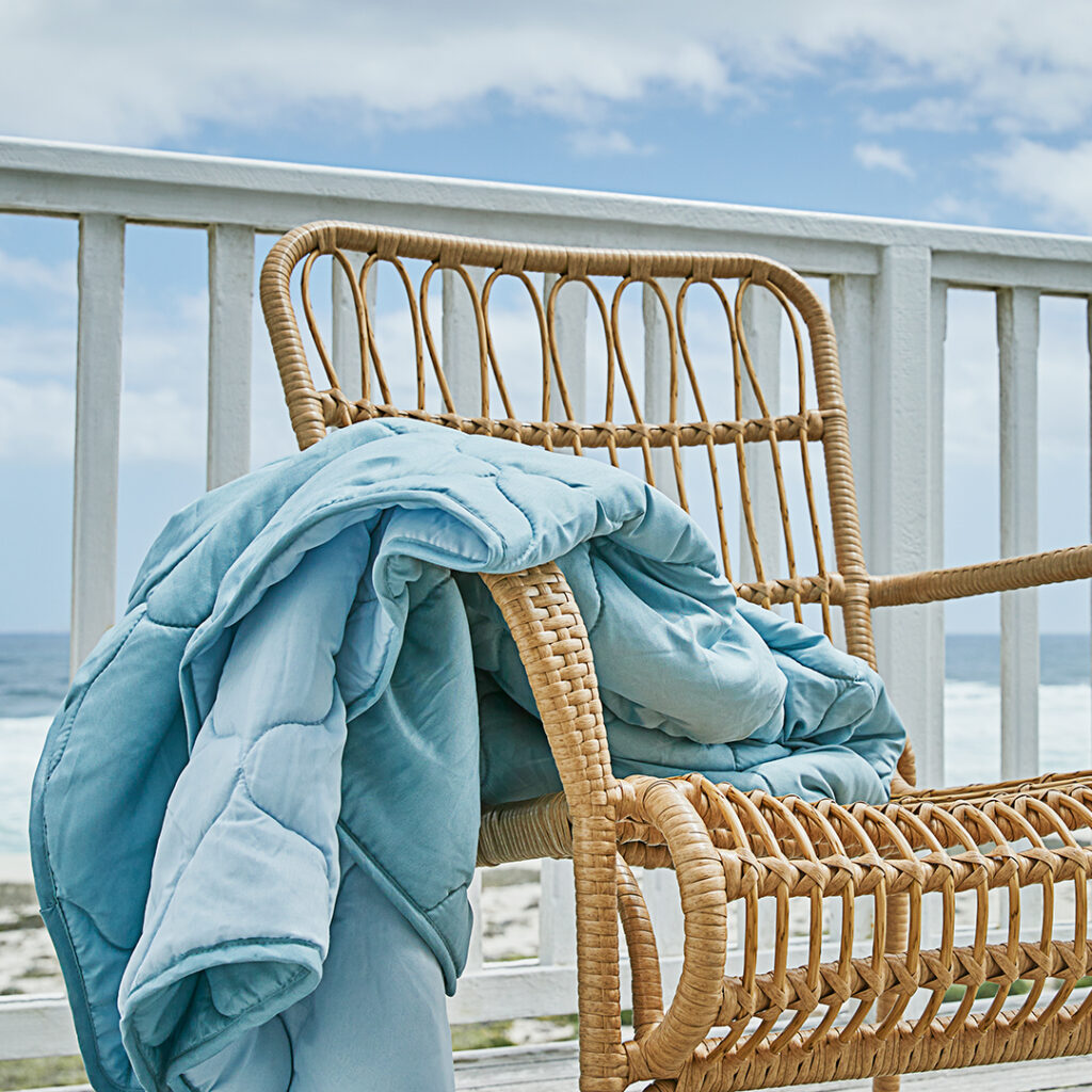 Светлосиниот летен јорган STETINDEN нема да ве стопли навечер, а класичната боја го прави совршен за употреба во фотелја на балконот.