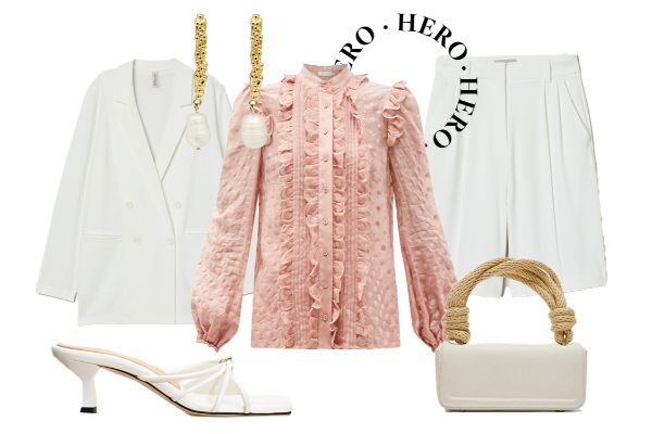 Прва опција – Користете ја оваа блуза за да внесете допир на женственост сo строго кроени парчиња – ви предлагаме да оберете сезонски бермуди, за да создадете модерно чувство, обетки со бисер, папучи со ремени, бел блејзер и бела торба – Zara