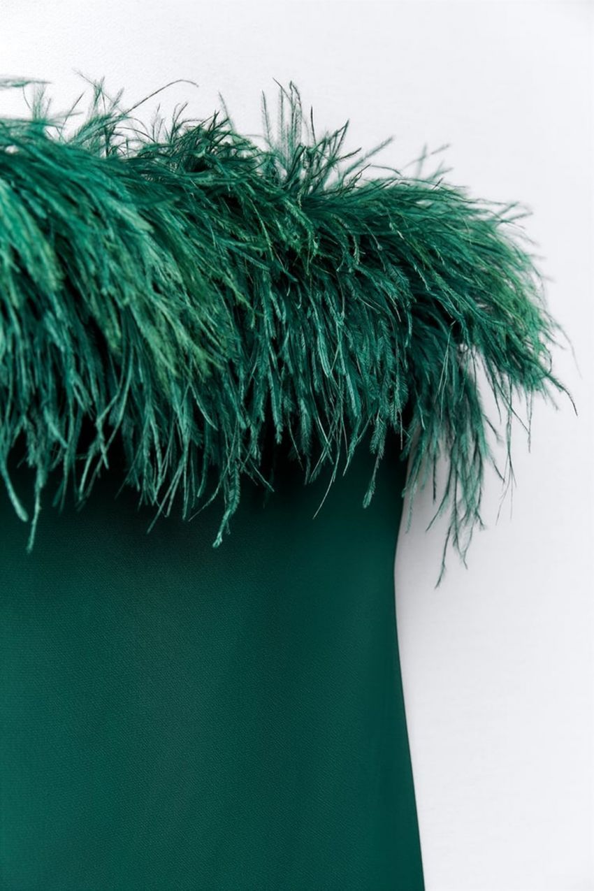 Станува збор за миди фустан, изработен од вискоза. Без прерамки со рамно деколте украсен со аплицирани пердуви во иста боја. Бојата на овој фустан е прекрасна, темнозелена нијанса.