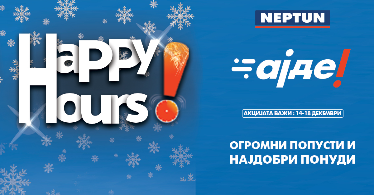 Само од 14-ти до 18-ти декември во Нептун продавницата во Скопје Сити Мол има супер акција Happy Hours со огромни попусти и најдобри понуди! Ајде во Нептун Скопје Сити Мол разгледајте ги понудите и изберете од најголемиoт избор на: телевизори, фрижидери, машини за перење и сушење, плотни, фурни, лаптопи и таблети, мобилни телефони, мали апарати за домаќинство и апарати за нега и убавина од брендовите: Beko, Samsung, LG, Huawei, Sony, Apple, Grundig, Elektrolux, Candy, Asus, Acer, Lenovo, Fuego, Bosch, Tefal, Rowenta и многу други.