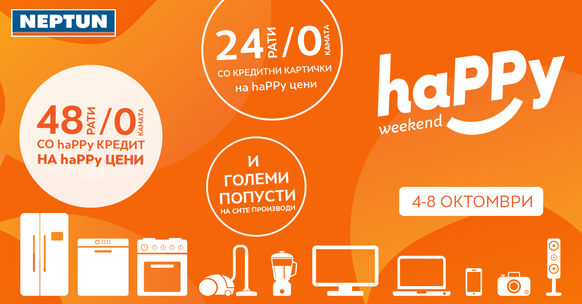 Од 04-08 октомври, до 48 рати без камата со haPPy кредитот или до 24 рати без камата со кредитните картички (на НЛБ Банка, Стопанска банка АД Скопје, Охридска Банка, Халк Банка и Дајнерс МК) потрошувачите ќе можат да си ги купат потребните производи по промотивни – haPPу цени со големи попусти.
