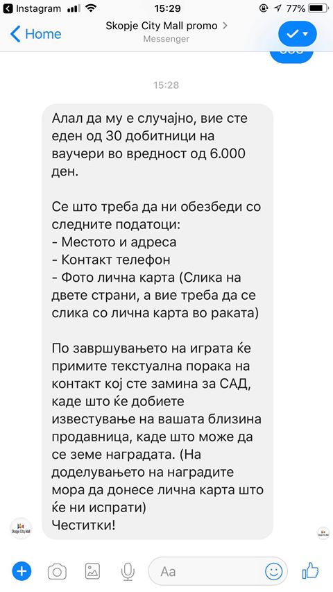 Почитувани фанови, денеска се појави лажна фејсбук страница која го злоупотребува името на Скопје Сити Мол и ги лаже и злоупотребува граѓаните ширејќи лаги и невистини како слика во прилог.
