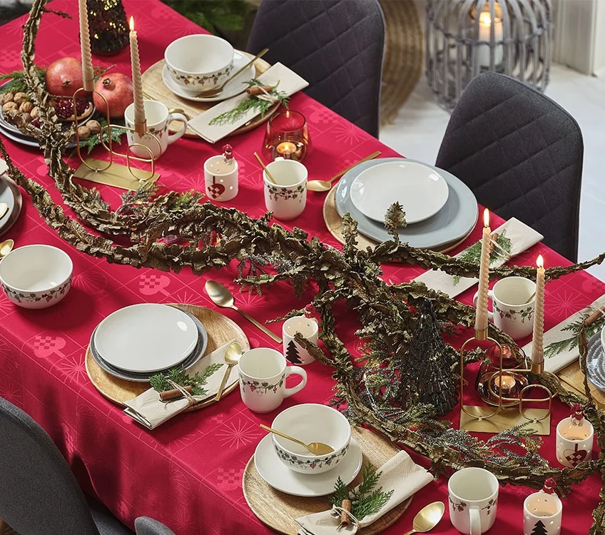 Направете декорации за масата со црвена боја и елементите на природата. Многу е лесно да се направи и да изгледа неверојатно и магично. Користете чаршав GULDSTEN и најдете борови, стари украсни гранчиња и користете ги како главен елемент од декорацијата за трпеза. Додадете HORNBLENDE чинии, чинивчиња, шолји и свеќници како што се SKINFAXE, HARMOND или гламурозниот свеќниќ ERVIN.