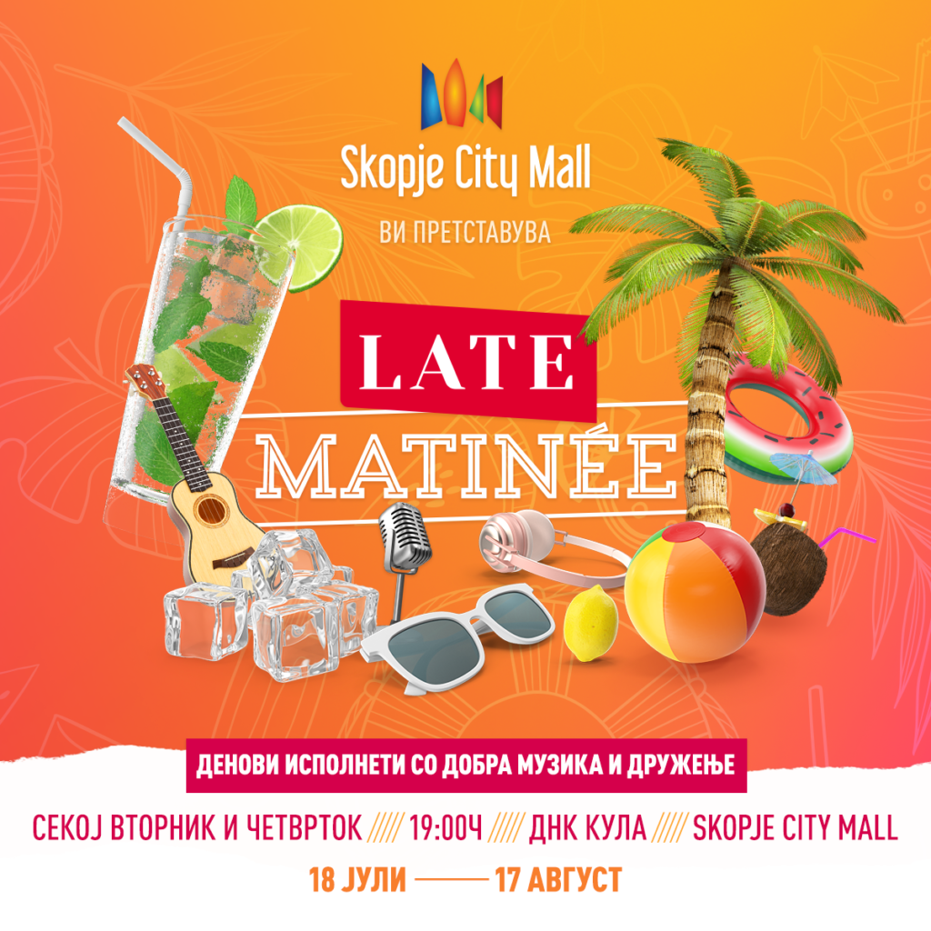 Почнувајќи од 18 јули, секој вторник и четврток во јул и август, од 19:00 до 21:00 часот Скопје Сити Мол ќе биде местото за уживање на музичките сладокусци во Late Matinee (Доцно Матине) на несекојдневната урбана сцена поставена во урбаниот парк пред трговскиот центар. Изборот на програмата и изведувачите на Late Matinee ги отсликува заложбите на Скопје Сити Мол за промовирање на градската модерна културна сцена во која, овој пат, посетителите на трговскиот центар и жителите на Скопје може да уживаат во звуците на настапите на новите, но и веќе познати имиња на македонската музичка сцена кои носат модерен урбан звук, дух и култура.