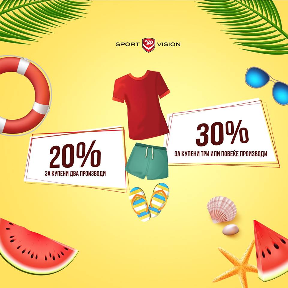 Во мултибренд продавницата на Sport Vision добивате 20% попуст за купување на 2 производи и 30% попуст за купување на 3 или повеќе производи од асортиманот на папучи, маици и шорцеви!