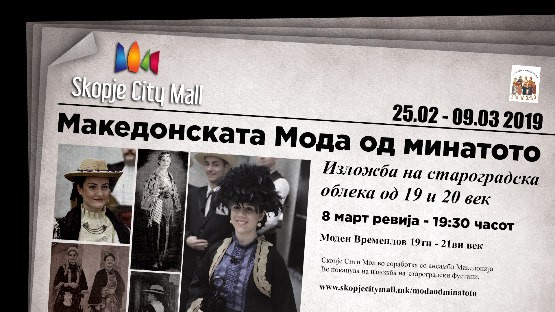 По повод меѓународниот ден на жената, 8-ми март, Скопје Сити Мол во соработка со Ансамбл Македонија, ја организираат првата јавна поставка на староградски модни изгледи на жената во Македонија насловена како “Македонската Мода од минатото“.