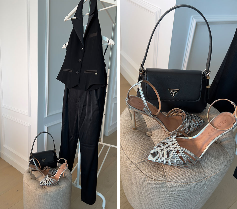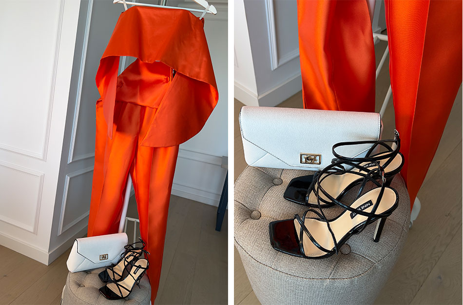 Девојките кои сакаат впечатлив аутфит можат да изберат костум во боја со „пресврт“. Наместо блејзер, земете корсет и дајте предност на необичен крој. Неутралниот, геометриски дизајн на чантата и чевлите лесно ќе се вклопат.