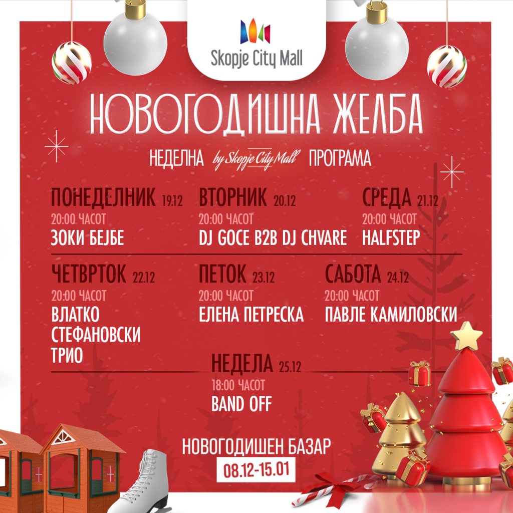 Кој празничен настап со нетрпение го очекувате? Ние велиме: СИТЕ! Ова е целата музичка програма за оваа недела 🎄⛸️ На катната гаржа од Скопје Сити Мол имаме новогодишен базар! Лизгалиште за сите генерации, џиновски новогодишен лампион за фотографирање, голема новогодишна елка, бина за супер настани како и магично празнично село. Се гледаме на руфтоп новогодишен базар во Скопје Сити Мол