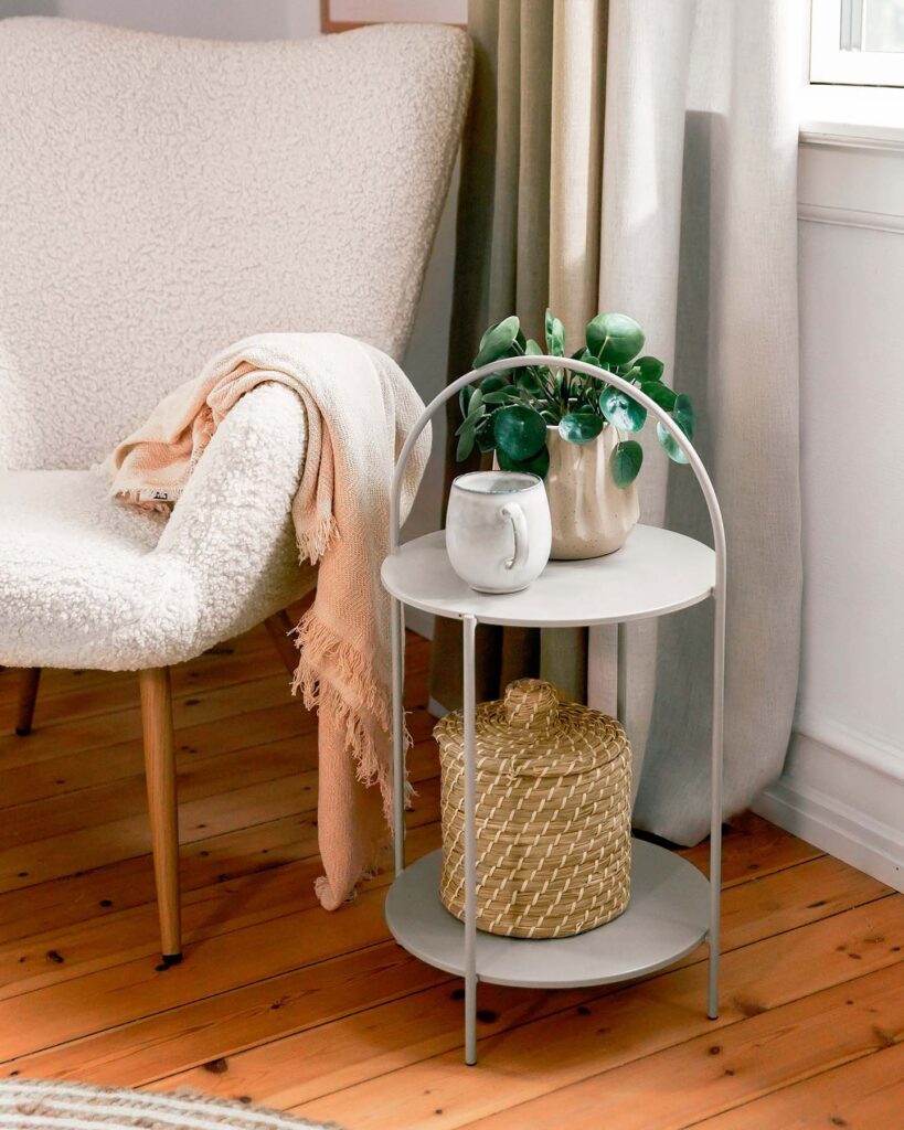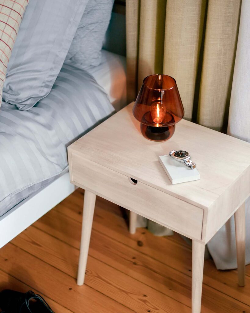 Масичката покрај креветот е идеална за складирање на вашите неопходни предмети. Поставете мала ламба и ќе имате лесен пристап во текот на ноќта.