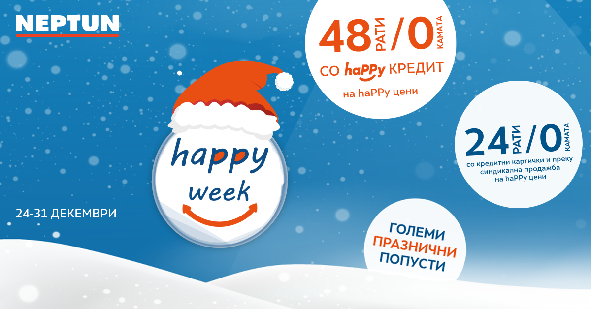 HAPPY WEEK акција во Нептун со големи празнични попусти и до 48 рати БЕЗ камата на СИТЕ производи на happy цени! Од 24-31 декември, до 48 рати без камата со haPPy кредитот или до 24 рати без камата со кредитните картички, потрошувачите ќе можат да си ги купат потребните производи по промотивни – haPPу цени со големи попусти. Нептун со оваа акција им овозможи шопинг до 24 рати без камата и на синдикалните организации со кои има склучено договор за соработка.