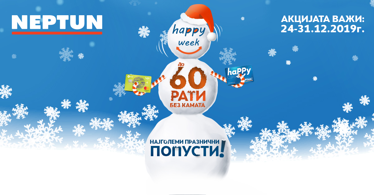 HAPPY WEEK акција во Нептун со најголеми празнични попусти и до 60 рати БЕЗ камата на цените со попуст! Од 24-31 декември, до 60 рати без камата со haPPy кредитот или до 24 рати без камата со кредитни картички и синдикална продажба, потрошувачите ќе можат да си ги купат потребните производи по промотивни цени со големи попусти.