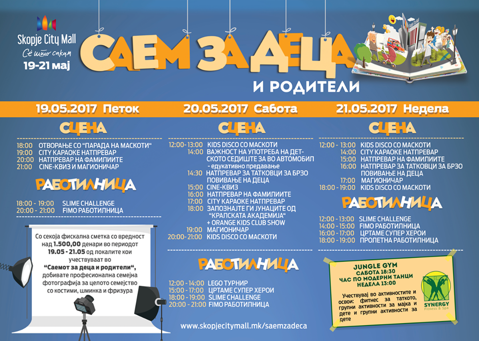 Од 19ти мај во Skopje City Mall започнува Саемот за деца и родители и ќе трае сѐ до недела. Благодарение на различните активности кои се атрактивни за сите возрасти, настанот кој преминува во традиција, ќе ги спои семејствата со многу изненадувања и забава за сите, особено за најмладите.