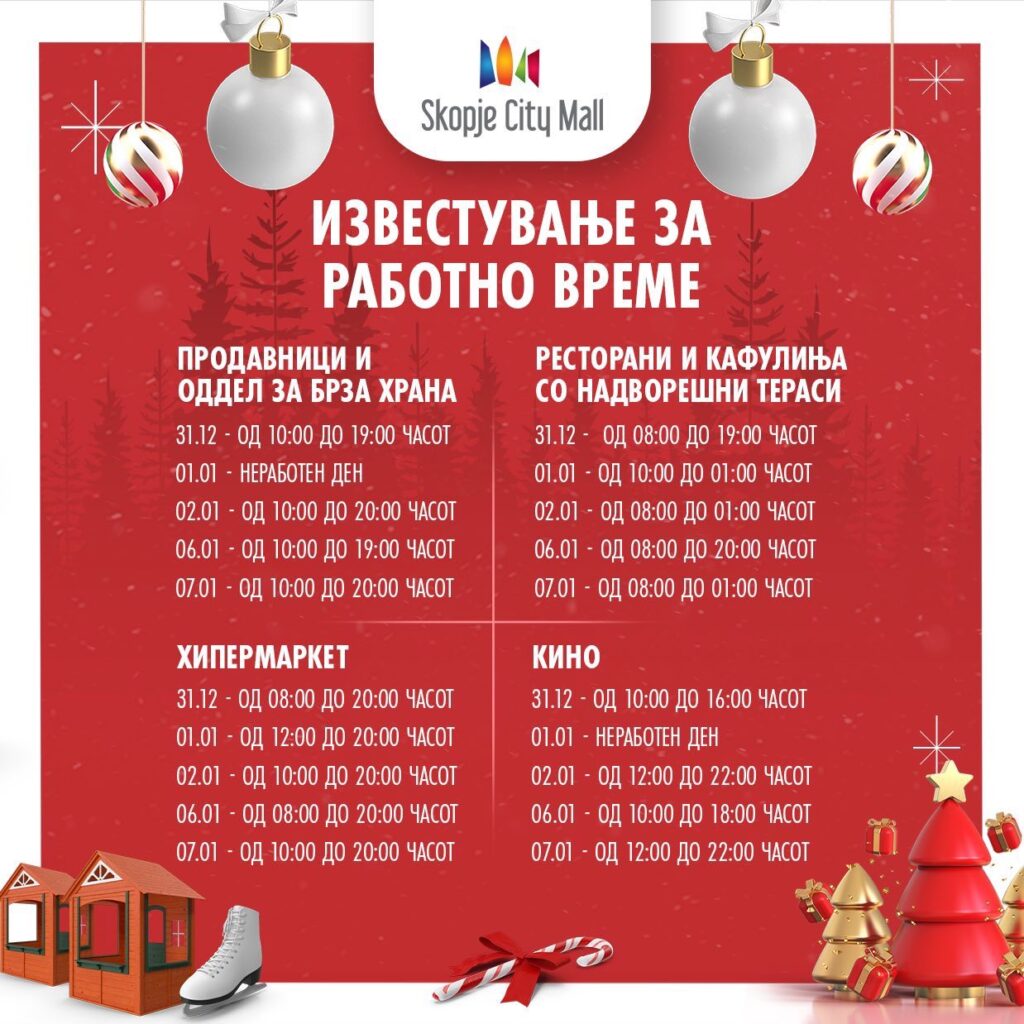 Празнично работно време за престојните празници на Skopje City Mall22.12.202229.12.2022Категорија: Блог Tweet Tweet
