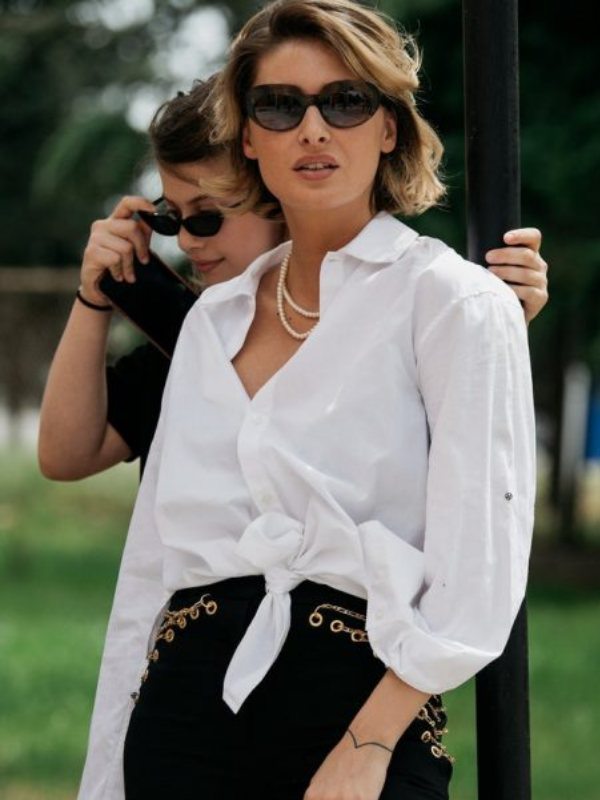 Комбинацијата на бела кошула и ѓердан со бисери можеби звучи конзервативно, но дефинитивно може да се вклучи во модерен изглед. Доволно е да ја врзете кошула во јазол, да додадете ѓердани и златен накит во вашиот стил и на тој начин автоматски да добие помодерен изглед.
