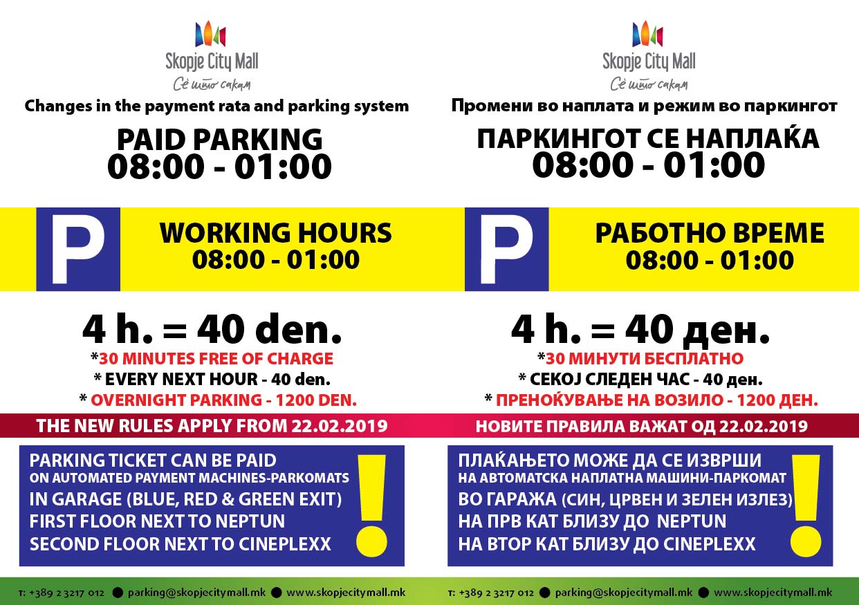 Ве известуваме дека СКОПЈЕ СИТИ МОЛ, воведува нов режим во однос на паркингот. Работното време на паркингот од 08 до 01 часот останува исто, додека транзитниот бесплатен период ќе изнесува 30 минути.