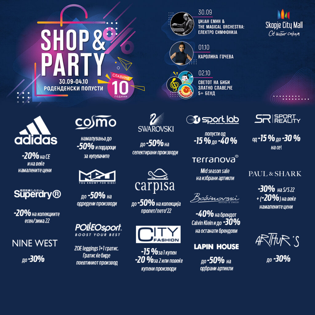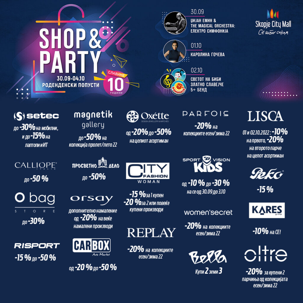 Со голема роденденска прослава и огромни попусти како што и доликува на најомилениот трговски центар во главниот град, Скопје Сити Мол го одбележува десетгодишниот јубилеј. Со концерти и забава прилагодена на различни вкусови и возрасни групи, Скопје Сити Мол ќе ги прослави првите 10 години од своето постоење. Од огнено шоу, огромни маскоти, фотобут за супер фотки, детска програма до големи концерти овој викенд сите сме во Скопје Сити Мол.