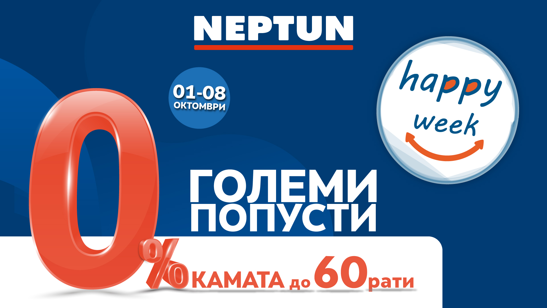 HAPPY WEEK акција во Нептун со големи попусти и до 60 рати БЕЗ камата на цените со попуст! Од 01-08 октомври, до 60 рати без камата со haPPy кредитот или до 24 рати без камата со кредитни картички и синдикална продажба, потрошувачите ќе можат да си ги купат потребните производи по промотивни цени со големи попусти. Разгледајте ги понудите во 25-те продажни салони на Нептун ширум Македонија и изберете од најголемиoт избор на: компјутери, лаптопи и таблети, мобилни телефони, телевизори, клима уреди, фрижидери, машини за перење/сушење, плотни, фурни, мали апарати за домаќинство и апарати за нега и убавина од брендовите: Beko, Samsung, LG, Huawei, Sony, Apple, Grundig, Elektrolux, Candy, Asus, Acer, Lenovo, Fuego, Bosch, Tefal, Rowenta и многу други. Целокупната понуда за акцијата Happy Week, може да се разгледа на https://www.neptun.mk/.