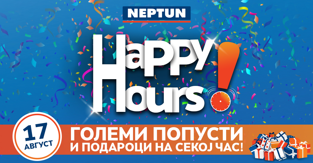 Само овој понеделник 17-ти август HAPPY HOURS акција во Нептун со големи попусти и подароци на секој час! Посетете ја Нептун продавницата во Скопје Сити Мол овој понеделник, разгледајте ги одличните понуди, купете и бидете потенцијален добитник на еден од 250-те подароци. Акцијата важи во сите 25 продавници на Нептун ширум државата, како и онлајн на нивната веб страна https://www.neptun.mk/. Не ја пропуштајте оваа шанса за шопинг по одлични цени со големи попусти и можност да добиете подарок!