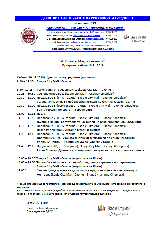 Настанот ќе изобилува со многу активности, а изложбите и натпреварите во изработки, демонстрации, експерименти, симулации и модели се од отворен тип и може да ги посети секој што е заинтересиран. Програмата на е објавена „Во светот на Физиката“ можете да ја погледнете на www.skopjecitymall.mk/svetnafizika