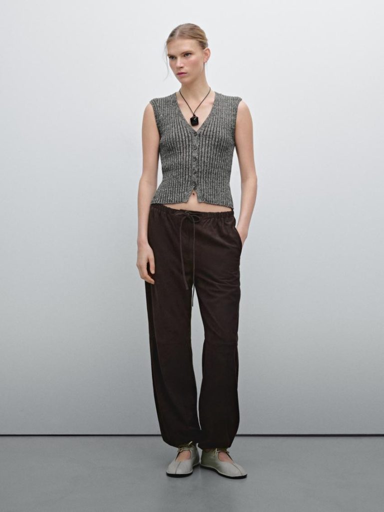Панталони од кожа со финиш од велур. Два странични џебови. Половината се прилагодува со врвки. Мека и пријатна ткаенина на допир.