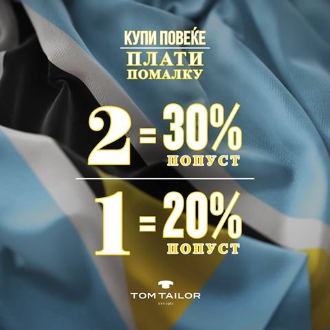 Tom Tailor те кани на шопинг!16.08.201716.08.2017Категорија: Шопинг Понуди Tweet Купи повеќе, плати помалку Tom Tailor те кани на шопинг! #summer #Tomtailor #SkopjeCityMall Tweet