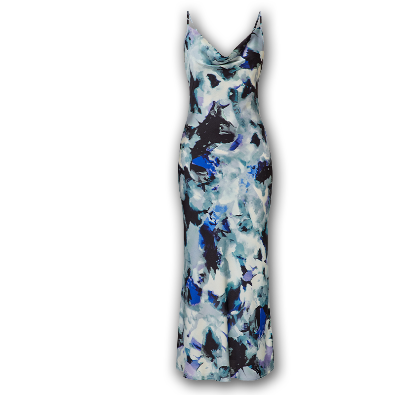 За исклучителна флуидност и мекост при движењето, изберете slip фустан со разигран цветен дезен од најновата колекција GUESS