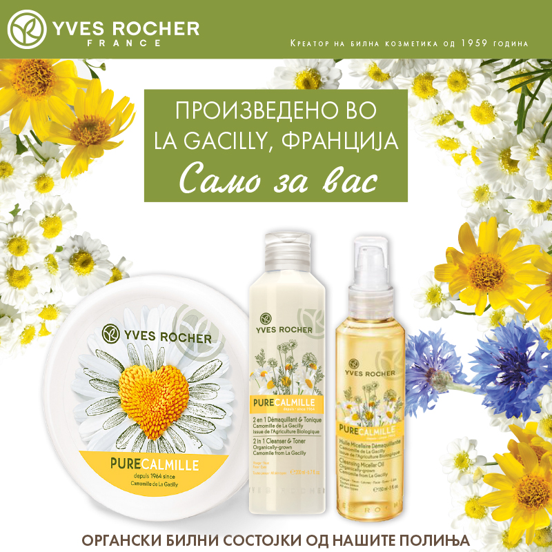 Истражувачите за убавина од  билките на Yves Rocher одбраа органски одгледан вид на полињата во La Gacilly, Франција, кој е богат со корисни состојки. За прв пат органски одгледаната камилица е преработена во својот најчист облик, со 100% природен процес на екстракција, без употреба на разредувачи и без губиток на нејзините својства.