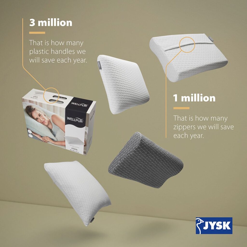 Во март 2023 година, сите ергономски перници од асортиманот WELLPUR на JYSK ќе бидат лансирани во продавниците и онлајн со подобрено пакување и производство што заштедува милиони пластични рачки и метални патенти секоја година.